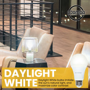 DAYLIGHT WHITE – Daylight bulbs imitate the sun’s natural light, and maximize color contract. For that reason, these bulbs are a good choice for kitchens, bathrooms and home offices. Additionally, these bulbs can brighten windowless spaces, like basements, that don't typically get natural light.