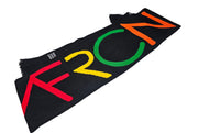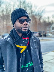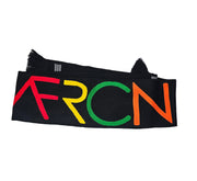 - Scarf measures 70 inches by 8 inches with 2.5-inch tassel and reads "THE AFRCN CLTXN".