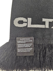 - Scarf measures 70 inches by 8 inches with 2.5-inch tassel and reads "THE AFRCN CLTXN".