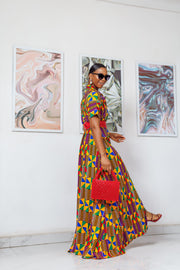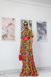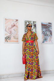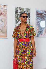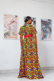 - This sophisticated unlined kaftan dress is designed with traditional African kente fabric shown in multi-colors. The buttoned front style is perfect for making a grand impression!