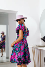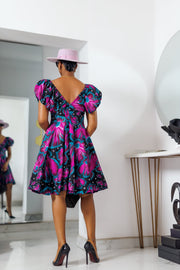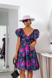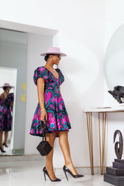 - This sophisticated unlined mini dress is designed with traditional African fabric shown in purple, blue and black. The V neck and puffy short sleeves are perfect for making a grand impression!
