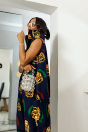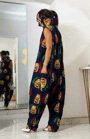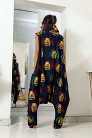 • This luxurious navy jumpsuit is made from cotton Ankara fabric. The full-body-length jumpsuit features a high neck and an oversized fit for style and comfort. The versatile outfit includes a zip-up detail for a jumpsuit, which you can simply unzip for a dramatic dress. Not only can you wear it as a jumpsuit or dress, but you have the choice to model the delicate front or dramatic back design. The multiple-wear attire is immaculate as a walking statement to fall in love with!