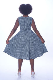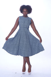• This short sleeveless dress is designed with African fabric. The boat neckline fits comfortably against the skin and also falls down to a full circle bottom for easy movement. The simple dress features tighter seams on the sides to emphasize the waistline. The fabric is delicately printed with simple grey patterns. Add a cardigan or jacket over the dress for warmth and elegance!