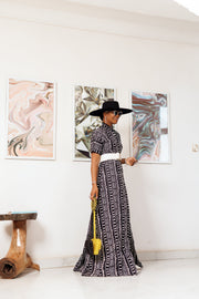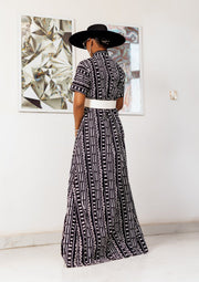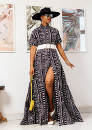 • This sophisticated unlined kaftan dress is designed with traditional African ankara fabric shown in white and black. The buttoned front style is perfect for making a grand impression!