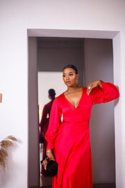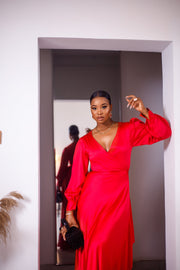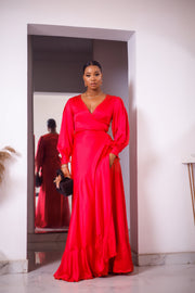 • This elegant unlined maxi dress, designed with a red silk fabric, was created to make you feel like royalty, whether you’re going to a dinner party or a wedding!