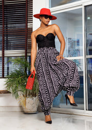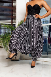 • These sophisticated parachute pants are designed with traditional African fabric shown in white and black. The wide leg fit and side pockets create a high class look without sacrificing comfortability!