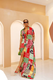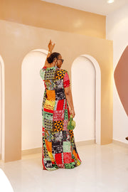 - This sophisticated unlined kaftan dress is designed with traditional Silk African Ankara fabric shown in multi-colors. The buttoned front style is perfect for making a grand impression!