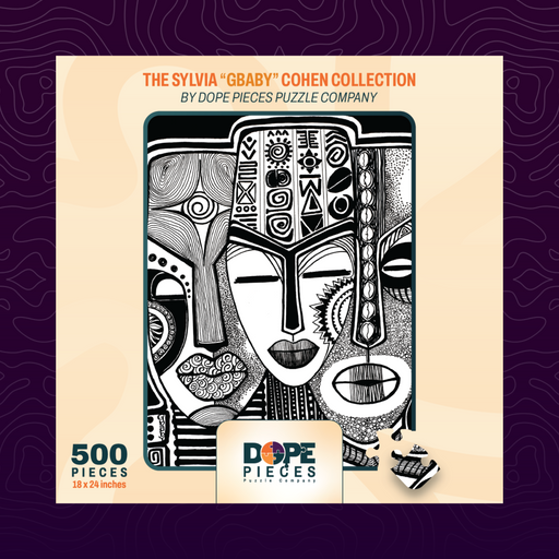 Wise Counsel is a 500-piece black-and-white puzzle by Sylvia “Gbaby” Cohen that captures the quiet strength and wisdom found in reflection and comm...